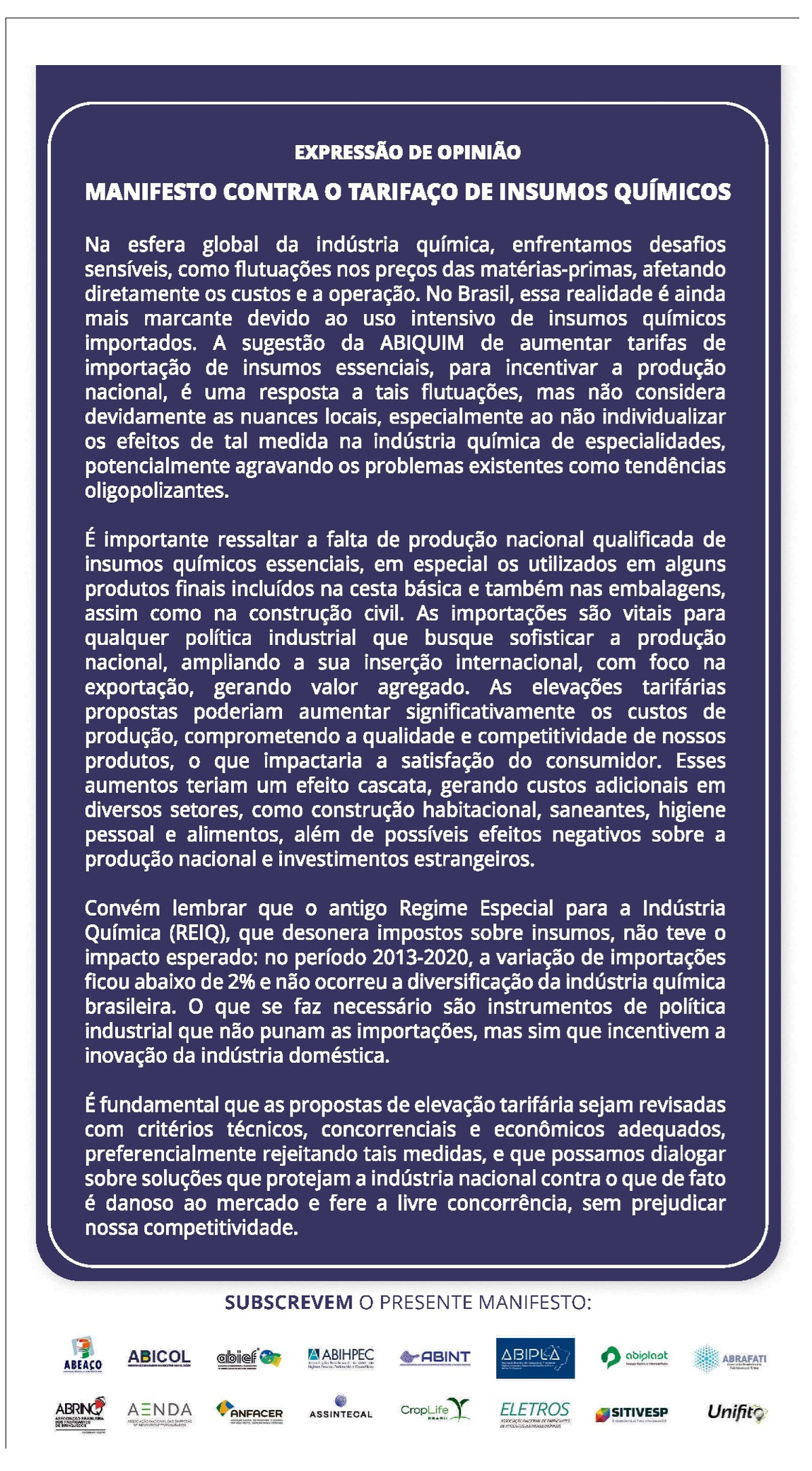 O manifesto destaca que não existe produção nacional qualificada suficiente de vários desses insumos e que a proposta de elevar as tarifas gera impactos significativos nos custos de produtos e serviços básicos como construção habitacional, saneantes, higiene pessoal e alimentos.